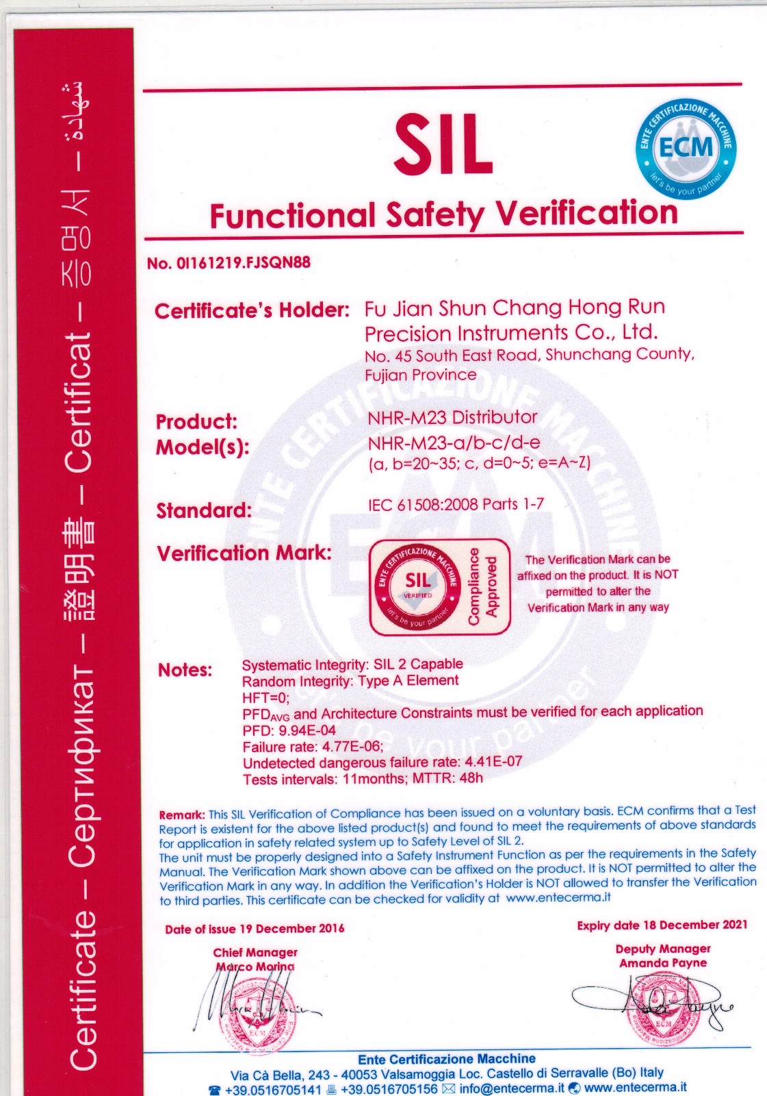 SIL2認證,是國際上公認的一種功能安全認證,英文全稱:Safety integrity Level—安全完整性等級。是根據國際電工委員會IEC頒布的功能安全標準IEC 61508(已轉化為國標GB/T 20438歸口標委會SAC/TC124/SC10)中對相關產品進行安全考核的認證要求。需要做SIL認證的產品,都是使用可能對人、環境或財產造成較高危害的場合,考核的主要目的也是,不能因為產品本身的功能問題,引起人員的傷害、環境污染和財產損失。