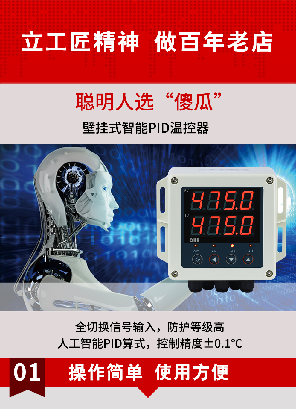 虹潤公司是專業生產溫控器的國家專精特新“小巨人”企業。生產的壁掛式PID溫控器,具有全切換信號輸入,真正人工智能算式,控制精度達士0.1°C,防護等級高,RS485通訊輸出DN等特點。產品獲得模糊PID控制儀及控制方法、人工智能調節器、智能化控制器、移相觸發控制器、閥門自動手動無擾動操作控制方法及裝置等5項國家發明專利,主持起草主持起草工業過程控制系統用模擬輸入兩位或多位輸出儀表、物聯網智能溫度儀表通用技術條件、工業過程測量和控制系統用智能調節器等3項國家標準,以及通信系統多通道數據采集控制終端規范軍用標準。參與國際5G標準制定,取得傻瓜式PID調節儀等3項相關軟件著作權。產品廣泛應用于電力、石化,冶金、制藥、食品等幾乎所有工業現場,實現精準控溫,保障生產安全與質量。