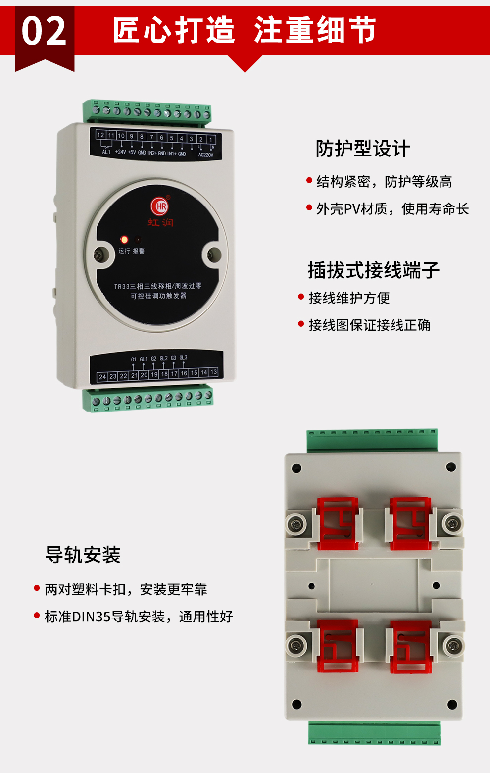 虹潤公司是專業(yè)生產(chǎn)移相觸發(fā)器的國家專精特新“小巨人”企業(yè),生產(chǎn)的移相觸發(fā)器,具有采用光電隔離設(shè)計(jì),自動(dòng)同步功能,過流保護(hù)技術(shù),電源缺相檢測,信號(hào)超限報(bào)警等特點(diǎn)。產(chǎn)品獲得巡回檢測顯示方法及裝置、儀表殼體等2項(xiàng)國家發(fā)明專利,主持起草工業(yè)過程控制系統(tǒng)用模擬輸入兩位或多位輸出儀表、物聯(lián)網(wǎng)智能溫度儀表通用技術(shù)條件等2項(xiàng)國家標(biāo)準(zhǔn)以及通信系統(tǒng)多通道數(shù)據(jù)采集控制終端規(guī)范軍用標(biāo)準(zhǔn),參與國際5G標(biāo)準(zhǔn)制定,取得外置移相觸發(fā)器等2項(xiàng)相關(guān)軟件著作權(quán)。產(chǎn)品廣泛應(yīng)用于工業(yè)溫控、電極控制、航天軍工、電爐溫控、食品醫(yī)藥等諸多領(lǐng)域。