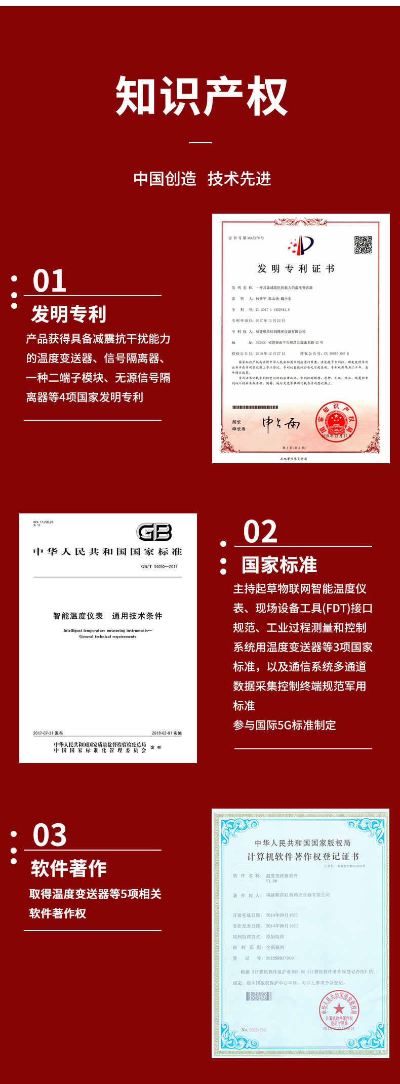 虹潤(rùn)公司是專(zhuān)業(yè)生產(chǎn)溫度變送器的國(guó)家專(zhuān)精特新“小巨人”企業(yè)。生產(chǎn)的溫度變送器,具有采用磁隔離技術(shù),配套編程器可修改參數(shù),抗干擾能力強(qiáng),穩(wěn)定性好,帶RS485或HART通訊等特點(diǎn)。該產(chǎn)品不僅通過(guò)HART基金會(huì)認(rèn)證、德國(guó)萊茵 CE 認(rèn)證與 SIL 功能安全認(rèn)證,還獲得具備減震抗干擾能力的溫度變送器、信號(hào)隔離器、一種二端子模塊、無(wú)源信號(hào)隔離器等4項(xiàng)國(guó)家發(fā)明專(zhuān)利,主持起草物聯(lián)網(wǎng)智能溫度儀表、現(xiàn)場(chǎng)設(shè)備工具(FDT)接口規(guī)范、工業(yè)過(guò)程測(cè)量和控制系統(tǒng)用溫度變送器等3項(xiàng)國(guó)家標(biāo)準(zhǔn),以及通信系統(tǒng)多通道數(shù)據(jù)采集控制終端規(guī)范軍用標(biāo)準(zhǔn),參與國(guó)際5G標(biāo)準(zhǔn)制定,取得溫度變送器等5項(xiàng)相關(guān)軟件著作權(quán)。產(chǎn)品廣泛應(yīng)用于石油、電力、化工,冶金、制藥、紡織、橡膠制造等工業(yè)領(lǐng)域現(xiàn)場(chǎng)自動(dòng)化測(cè)溫過(guò)程。