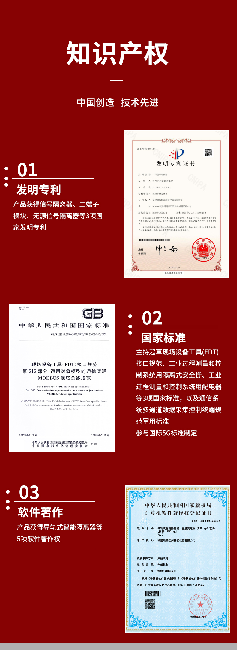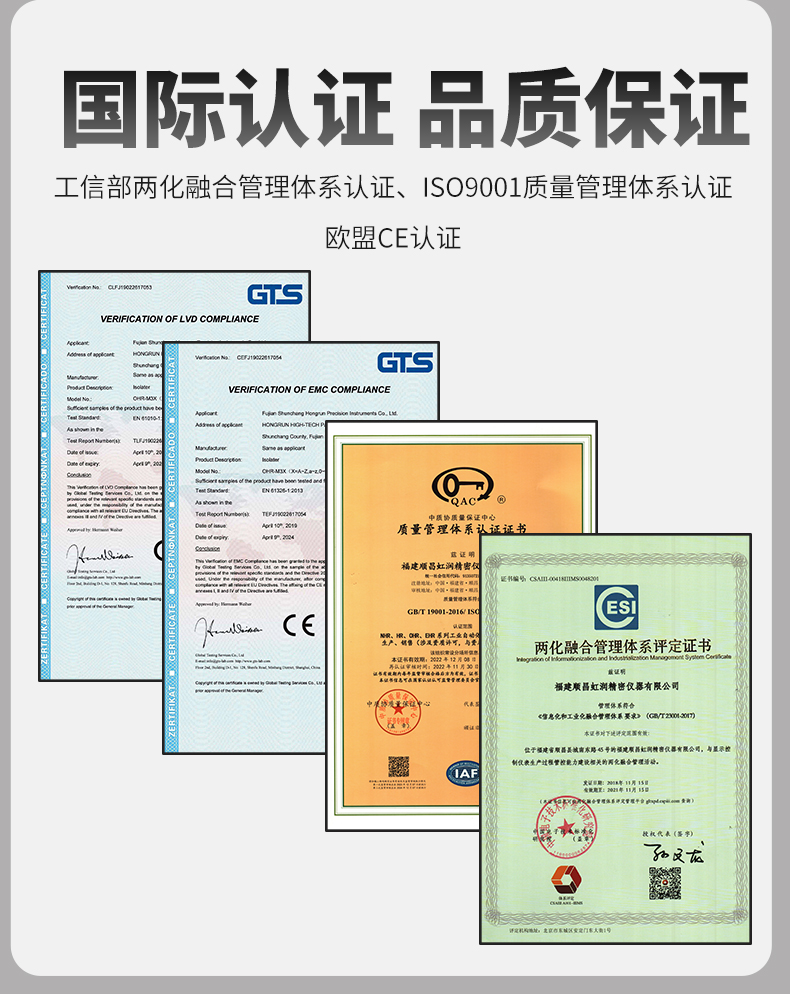 虹潤公司是專業生產隔離器的國家專精特新“小巨人”企業。生產的智能信號隔離器涵蓋電流電壓變送器、溫度變送器、配電器、頻率轉換器、開關量轉換器及通訊轉換器等多種產品類型。產品獲得信號隔離器、一種二端子模塊、無源信號隔離器等3項國家發明專利,主持起草現場設備工具(FDT)接口規范、工業過程測量和控制系統用隔離式安全柵、工業過程測量和控制系統用配電器等3項國家標準,以及通信系統多通道數據采集控制終端規范軍用標準,參與國際5G標準制定,取得導軌式智能隔離器、頻率轉換器等3項相關軟件著作權。產品廣泛電力、冶金、工業電爐、變電站、高壓電機房等需要電隔離的工業自動化控制系統。