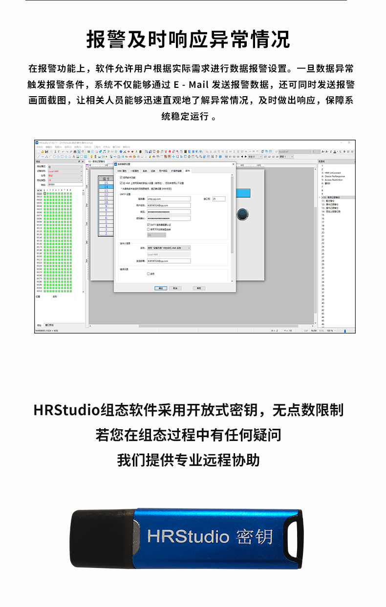 虹潤(rùn)?HRStudio?組態(tài)軟件采用開放式密鑰,無點(diǎn)數(shù)限制;凡購(gòu)買虹潤(rùn)帶有 RS485/232、以太網(wǎng)通訊功能的儀表,單筆訂單滿 3800 元,即免費(fèi)贈(zèng)送HRStudio 組態(tài)軟件及對(duì)應(yīng)密鑰;若您在組態(tài)過程中有任何疑問,我們提供專業(yè)遠(yuǎn)程協(xié)助。